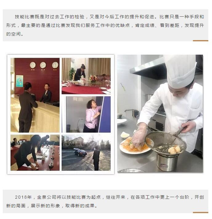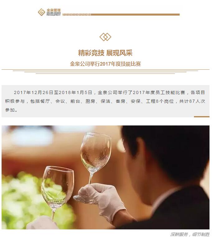2017年12月26日至2018年1月5日,金泉公司举行了2017年度员工技能比赛,各项目积极参与,包括餐厅、会议、前台、厨房、保洁、客房、安保、工程8个岗位,共计87人次参加