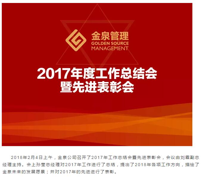 2018年2月4日上午,金泉公司召开了2017年工作总结会暨先进表彰会,会议由刘霜副总经理主持。会上孙莹总经理对2017年工作进行了总结,提出了2018年各项工作方向