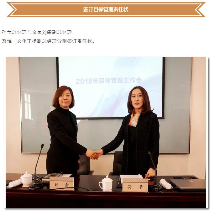 刘霜副总经理对金泉2017年目标管理工作进行了通报总结,并对18年各项目标的完成提出工作要求。党校项目经理于瀛代表管理者进行发言,表明了完成任务的决心和信心。最后,孙莹总经理对2018年目标管理工作提出了思路及要求,让我们更加坚定了方向和信心。相信在大家的共同努力下,一定能出色完成公司2018年的工作目标。